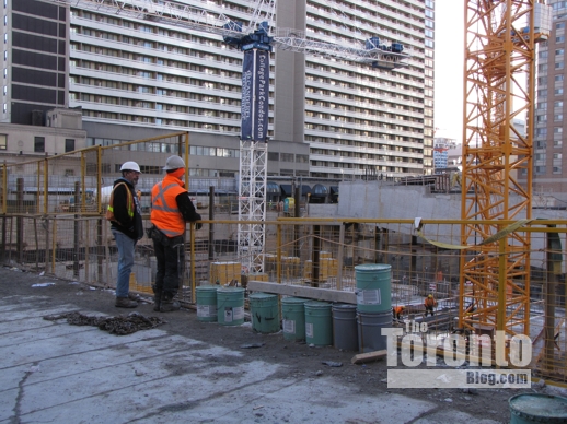 Work crews were easy to observe from the sidewalk on Yonge Street when I walked past the site’s entrance for concrete mixing trucks earlier this week. Last time I passed by, I couldn’t see any of the construction workers from the Yonge Street sidewalk because they were still too far down in the deep excavation.