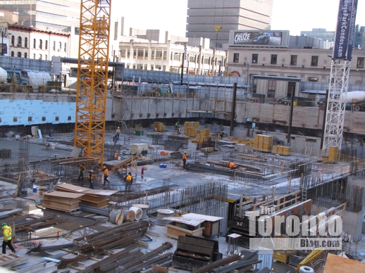 Growing closer to ground level: The huge hole in the ground at the northwest corner of Yonge and Gerrard Streets is filling in nicely. The foundation for Aura at College Park is rapidly taking shape as work crews continuing pouring concrete for the 75-storey condo tower’s extensive underground levels.