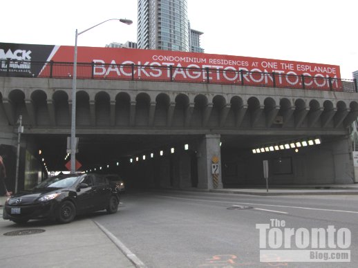 Marketing banner on Yonge Street railway underpass adjacent to Backstage site
