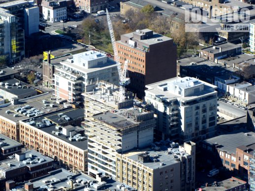 Below is a series of photos showing construction progress at Victory Condos. There are three shots showing the condo location in 2008 before construction commenced, a picture taken from the CN Tower in November, and several pics from just this past week.