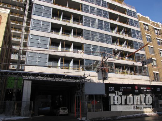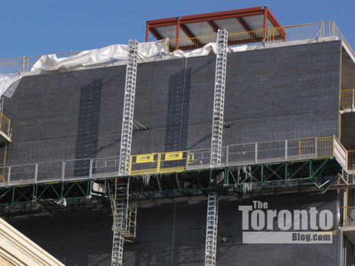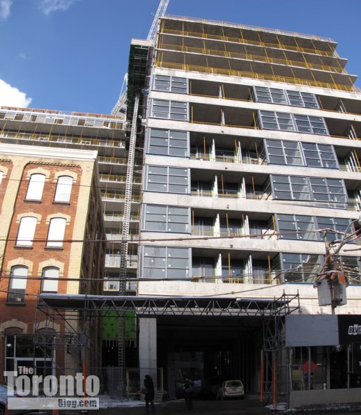 Building exterior nearly done: Window, brickwork and balcony installations are giving the exterior of Victory Condos on King Street West a more finished look this week.