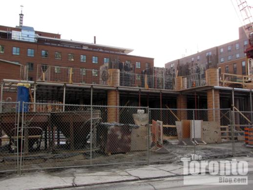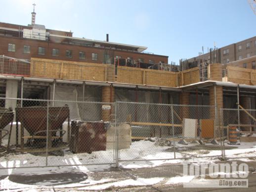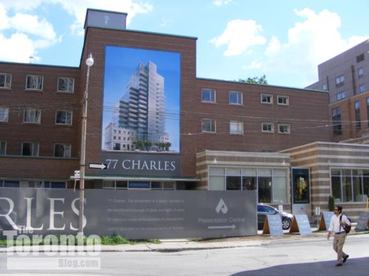 A project of Aspen Ridge Homes, the dual-purpose complex at 77 Charles West was designed by Yann Weymouth of international architecture firm HOK. You can read exactly how Weymouth has integrated two separate buildings into one mixed-use structure in this informative March 16 2007 column by John Bentley Mays of The Globe and Mail, so I won’t repeat those details here. Will Weymouth’s design vision for this unusual building combination succeed? We should be able to tell if he’s managed to pull it off once Seventy Seven’s glass curtain wall starts taking form, likely later this year.
