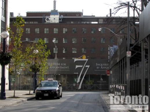 The St Thomas condo highrise site and sales office on the northwest corner of Charles and St Thomas Streets, right across the road from 77 Charles West