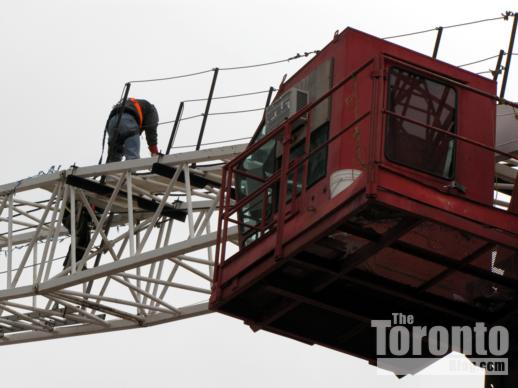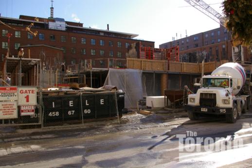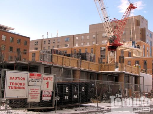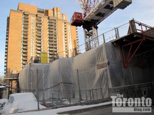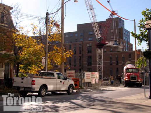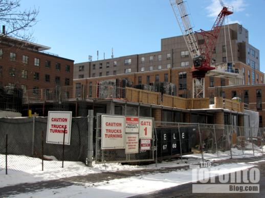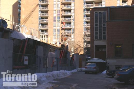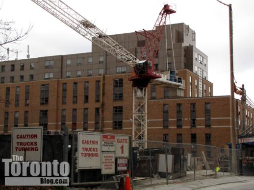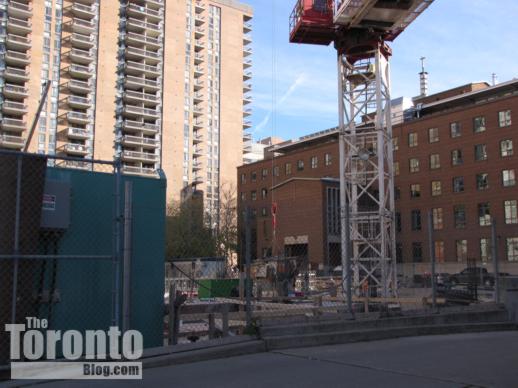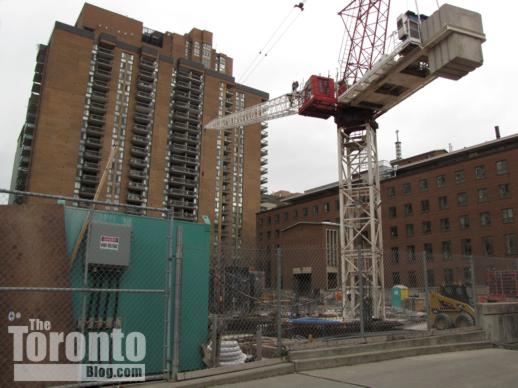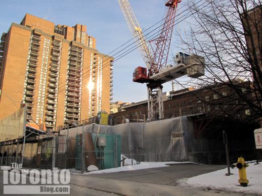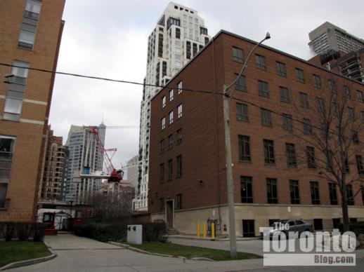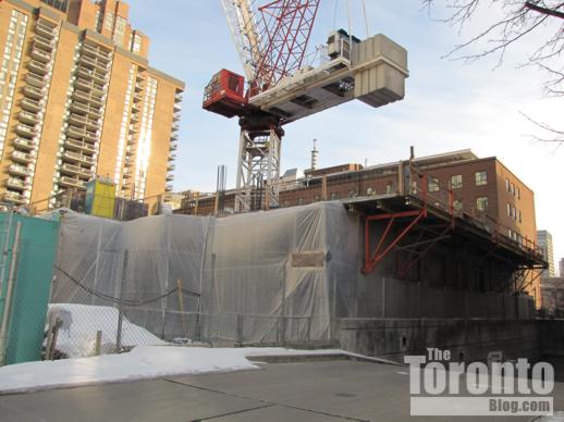 December 4 2010: Crane on the 77 Charles West site viewed from St Mary Street through the driveways between Rowell Jackman Hall, left, and Loretto College