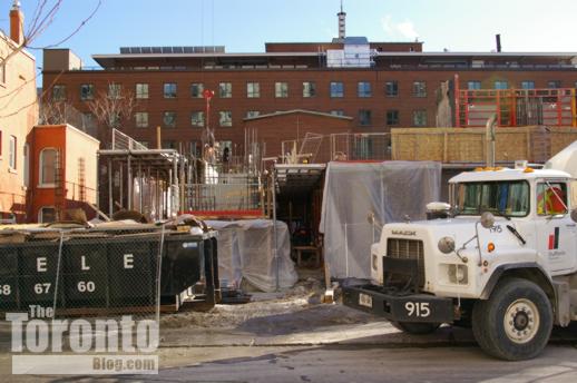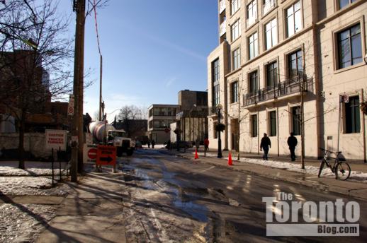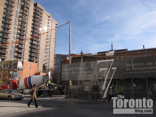 February 15 2011: View of 77 and its neighbours on Charles Street West. The cement truck is at 77 Charles, while One St. Thomas is the building at right. The sales office for The St Thomas condos is visible on the next block.