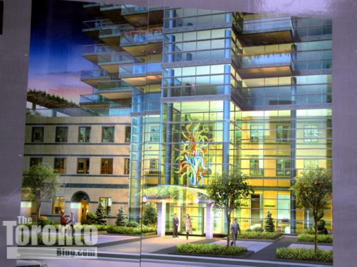 But maybe Seventy Seven’s buyers won’t mind. They might be too busy exploring nearby museums and cultural institutions or passing their time shopping and dining. As the condo website proudly points out, “trendy Yorkville, with its cornucopia of galleries, fashion, glamour and cuisine, is just minutes from 77 Charles.” I suppose that, for some people, gazing at the U of T grounds from a luxury balcony just couldn’t compare to window shopping at Prada and Chanel or peering into the glass jewellery display cases at Cartier. Below are several more architectural renderings from the Seventy Seven Charles West website, along with some of my pics of construction progress and the building’s current and future neighbours, which I mentioned above. More photos can be viewed in the “Bloor-Yorkville condo projects” album on the Photo Sets page of the blog.