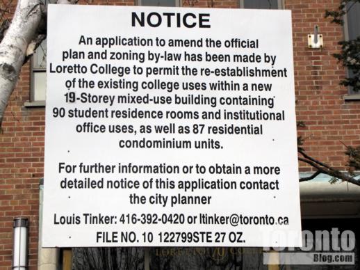 Loretto College site redevelopment proposal sign on St. Mary Street