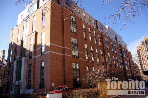However, what’s probably peeving some purchasers is the prospect of a slightly taller building going up right next door, obscuring many views entirely. Loretto College, a six-storey women’s residence that is part of St. Michael’s College at U of T, sits on St. Mary Street about 50 or so feet south of the Seventy Seven construction site. Last year, the college filed an application with the city for zoning approval to redevelop its site into a new 19-storey mixed-use building with office space, 90 student residence rooms, and 87 condominium units. If that proposal gets the green light, the new Loretto College will stand three floors taller than Seventy Seven. [Editor’s Note: A revised development application was subsequently filed with the City, proposing a 40-storey institutional and residence building. The new complex would have a 2-storey podium and 38-storey tower, and would include 115 student dormitory units, a chapel, 8 1-bedroom apartment units for chapel members, and 220 apartment units. As of January 2013, the application had not gone before Toronto City Council for approval.]
