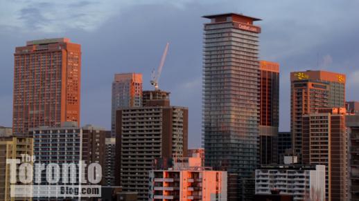Now you don’t … The Uptown on March 8 after its crane was removed. The crane boom poking out from behind the Casa condo tower (right) is building the new Four Seasons Toronto hotel & condo in Yorkville.