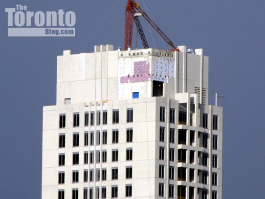 October 29 2010: The tower’s top southeast corner cladding cannot be installed until the construction crane has been removed from the roof.