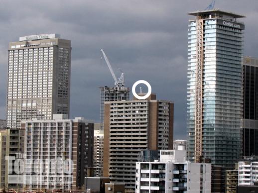 October 25 2009: My first glimpse of The Uptown’s crane, as the tip of the boom pokes above a nearby apartment building. The crane at left is atop The Uptown’s next-door neighbour, the Crystal Blu condominium tower.