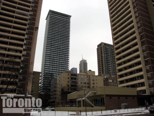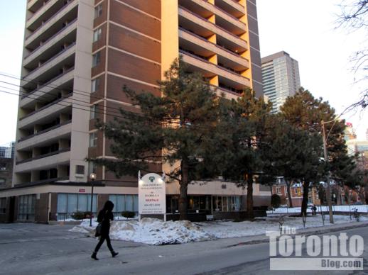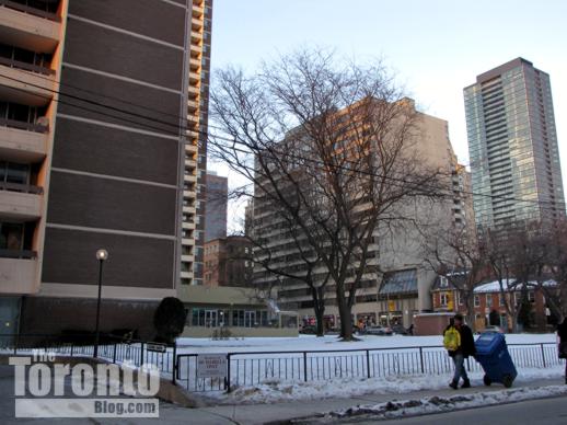 January 29 2011: The proposed building addition would block this Isabella Street view toward the Town Inn Suites hotel (center) and the midrise concrete and glass condo building at 73 Charles Street East (right).