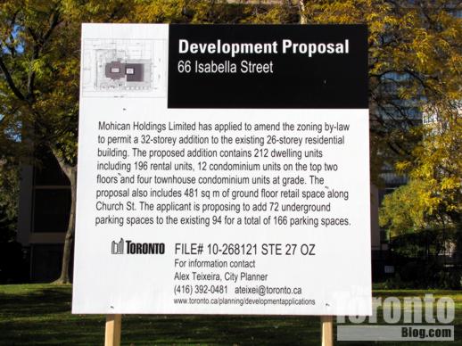 The site of the proposed new tower is a tree-shaded private lawn at the northwest corner of Church and Isabella Streets. The 66 Isabella apartments, built in 1970, stand at the west side of the lawn, while a “twin” tower built in 1972, the Town Inn Suites hotel, rises on the property’s north side. There are presently 200 apartment units in 66 Isabella. The proposed tower addition would contain 212 more units, which would include 196 rental apartments, four condominium townhouses at ground level on Isabella Street, 12 condominium suites on the top two floors, and 481 square meters of retail space at ground level along Church Street.