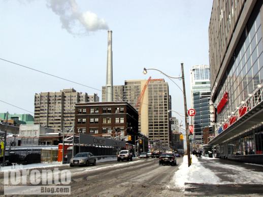 Snow motion: This photo was taken on the same day as the one above, a few blocks further north up Bay Street. It shows the Motion on Bay highrise apartment building construction site at left, along with the Sick Kids and Burano towers to the north.