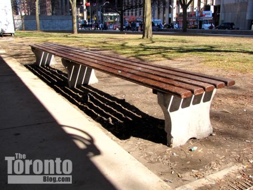 April 9 2011: A long bench on the ratty lawn along Queen Street. New planting and landscape surfaces will be installed in this area to help improve pedestrian flow into the Square.