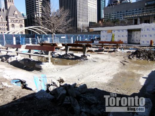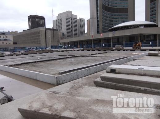 Scruffy Square: I have passed through Nathan Phillips Square several times since Christmas while busloads of tourists were arriving for a quick City Hall visit. It’s been interesting to watch the out-of-town visitors stream from their buses on Queen Street and wind their way toward the ever-popular winter skating rink/summer reflecting pond and fountain. Many look disappointed when they discover that renovation and construction work on several different parts of the Square make it difficult to get nice photos of Toronto City Hall. They wander around, searching for spots away from construction activity, garbage cans and other visual clutter so they can take pics of each other posing with the iconic clamshell towers in the background. A few couples and families have asked me to take their photo, urging me to “try not to get that stuff in the shot” — referring, of course, to construction crews, building materials and equipment, and temporary fencing around areas where work is in progress. Unfortunately for tourists, “that stuff” is going to be there for at least another year. The city’s long-overdue $43 million Nathan Phillips Square Revitalization project started one year ago this week, but the extensive renovation work is scheduled to continue until at least the middle of 2012. With major construction and landscaping activity underway at three prime places on the Square, most tourists probably won’t get a “perfect” picture of City Hall anytime soon. But I’m hoping they’ll enjoy their time in Toronto so much, they’ll come back once the Square’s makeover is complete. Because the Nathan Phillips Square they’ll see in a few years’ time will look vastly better than the dumpy plaza they’re seeing today.
