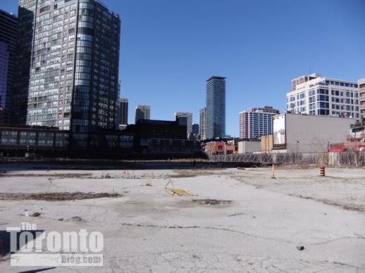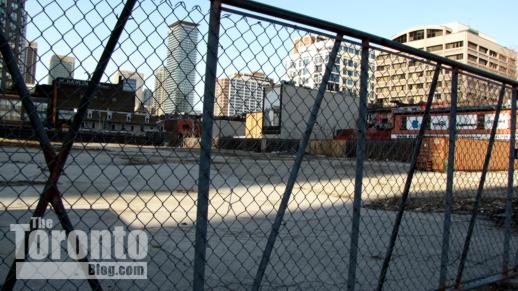 March 27 2011: Looking north at the big empty lot. At left is the Sutton Place Hotel; at center is the Century Plaza condo tower at 24 Wellesley St. W.