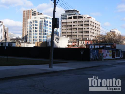 A skateboard park occupied the site for a few years until a developer acquired the western half of the property and built the Allegro at Opera Place condo tower and The Bay Club rental apartment building along Bay Street. The developer, Morguard, planned to build two more apartment buildings, 9 and 10 storeys tall, on the 11 Wellesley West site, along with a recreational amenities facility for the use of residents in all of the buildings (including two more Opera Place condo towers previously constructed one block south on Bay Street, between Breadalbane and Grosvenor Streets). However, shovels never got in the ground for the final phase of construction, and the property has sat vacant behind hoarding ever since — an eyesore that annoys hundreds of residents in the condos and apartments overlooking the site, not to mention passersby on Wellesley and Breadalbane.