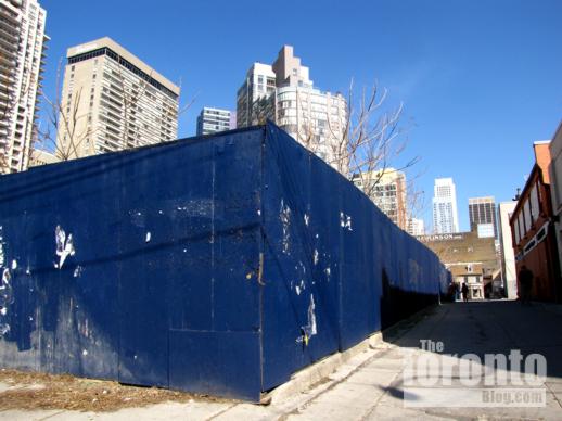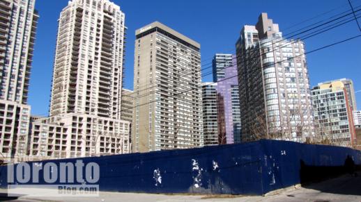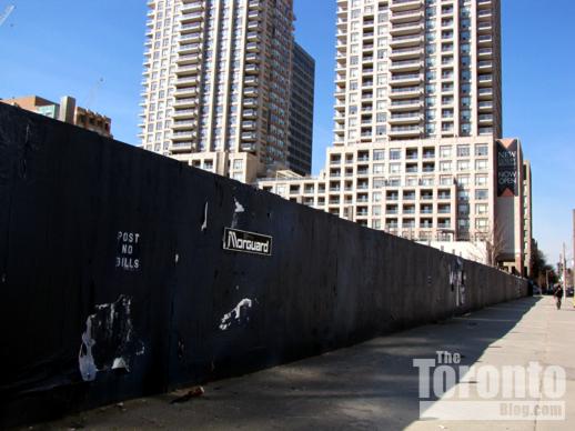 April 19 2011: A southwest view of hoarding around 11 Wellesley St. W., between Yonge & Bay Streets. Behind are the Murano condo towers (left), the Opera Place condos (center) and The Bay Club apartments (right), all on Bay St.