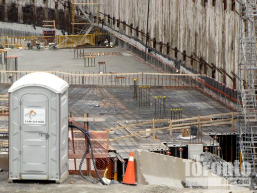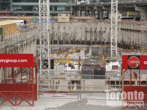 April 21 2011: Construction of the bottom underground level for Infinity3 approaches the west end of the site near Lower Simcoe Street