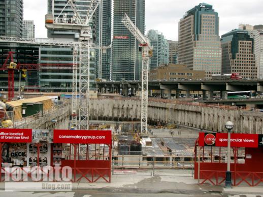 April 21 2011: The vast excavation for the two condominium tower projects stretches from York Street at the east to Lower Simcoe Street at the west