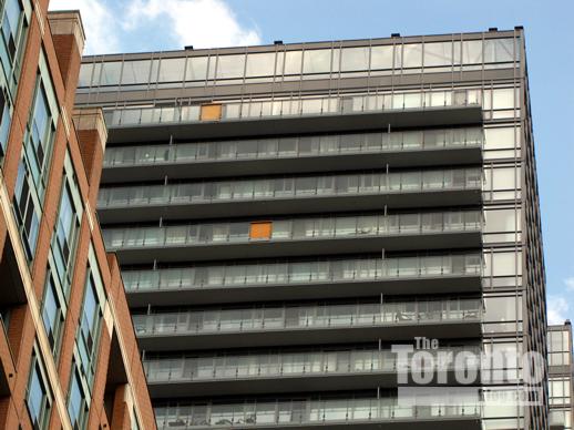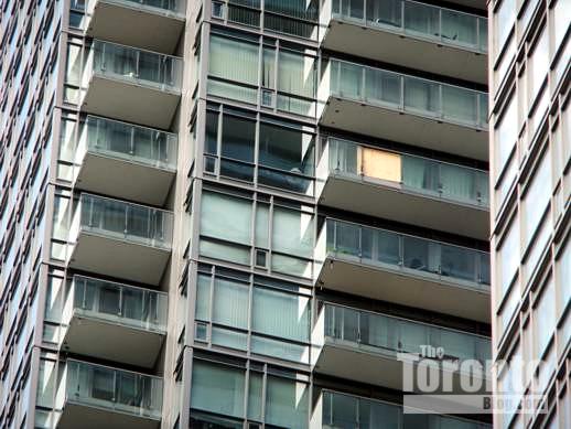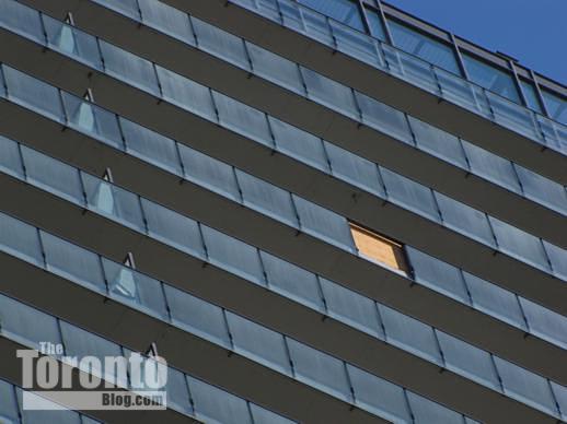 July 13 2011: Plywood replaces a glass balcony panel on the 252 Sackville Street apartment building in Regent Park