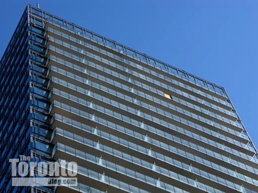 Today’s incident marks at least the fifth time that a balcony panel has broken and sprayed pieces of glass onto the streets and sidewalks below the two-tower complex on the east side of Bay Street, between Grosvenor and Grenville Streets. Exactly one month ago, I reported that the Bay Street sidewalk outside the Murano towers had been taped off after glass fell from a balcony on the upper south side of the North building. See my June 21 2011 post for full details and photos of that incident, along with links to other photos, posts and local news coverage reporting on previous incidents of balcony glass falling from the tower.
