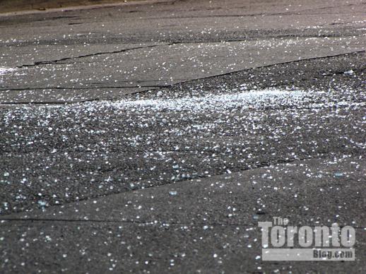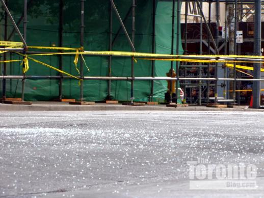 July 21 2011: Tiny pieces of shattered balcony glass litter the asphalt on Grosvenor Street outside the Murano North condo tower