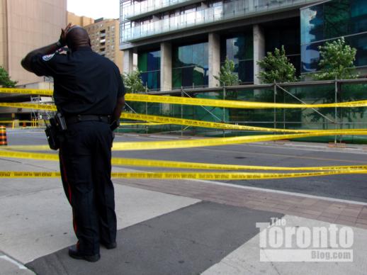 July 21 2011: A police officer and tape at the corner of Bay and Grosvenor