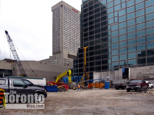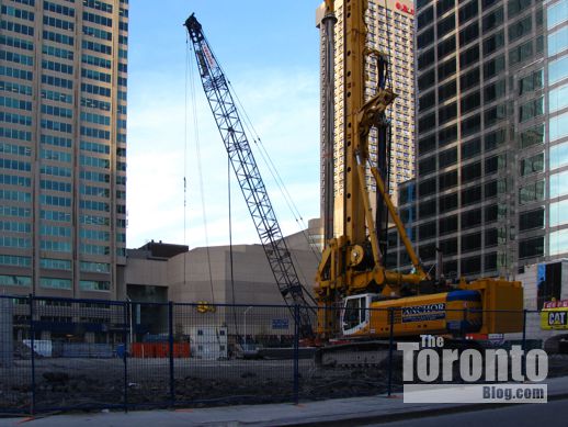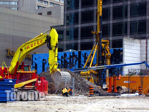 Site preparation: Drilling and shoring work continues at the construction site for the One Bloor condo tower at the southeast corner of Yonge & Bloor Streets. The work, which prepares the site for excavation, has been underway for over four months now.