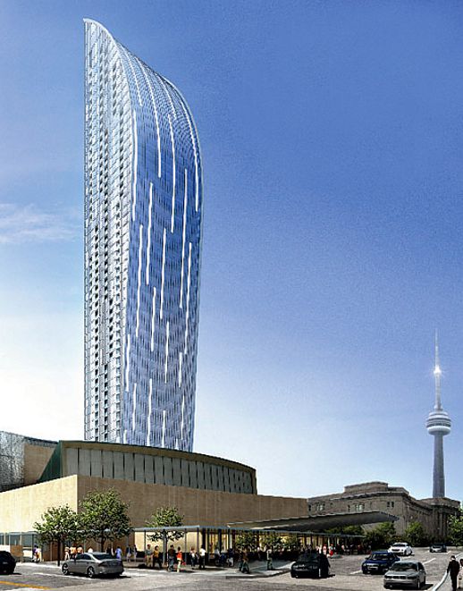 This illustration of The L Tower, from the condo project website, depicts a view of the building from the northeast (that’s the Sony Centre for the Performing Arts in the foreground). A rendering of the tower from a northwest perspective can be viewed in the Projects section of the Studio Daniel Libeskind website.