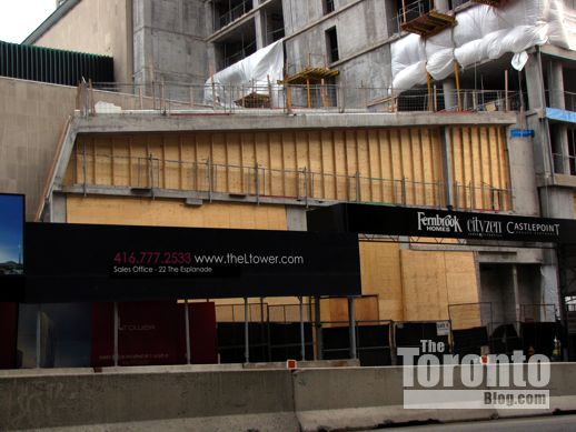 September 3 2011: Looking east from Yonge Street. The green west tower of the London on the Esplanade condo complex rises to the rear of The L Tower.