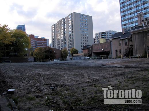 October 20 2012: Looking to the northwest across the vacant, muddy lot where buildings used to stand at 308 Jarvis Street and 225 Mutual Street. The property owner subsequently spread gravel on the ground and opened a parking lot.