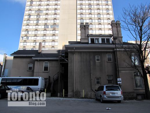 February 5 2012: Parking lot view of the south sides of the 314 Jarvis mansion and the Best Western Primrose Hotel tower at 111 Carlton Street