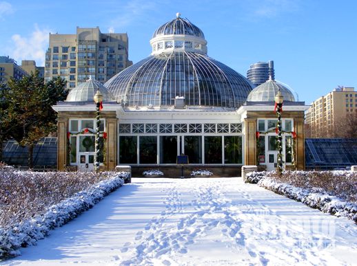 February 5 2012: The Palm House conservatory, left, and one of the four greenhouses connected to it. The Metropolitan Essex condo building on Jarvis is visible at center rear
