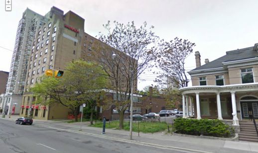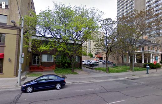 This image from Google Street View shows the Ramada Plaza Hotel at 300 Jarvis, left, the 2-storey brown brick office building that once occupied 308 Jarvis, and the Charles Sheard designated heritage mansion at 314 Jarvis, right.