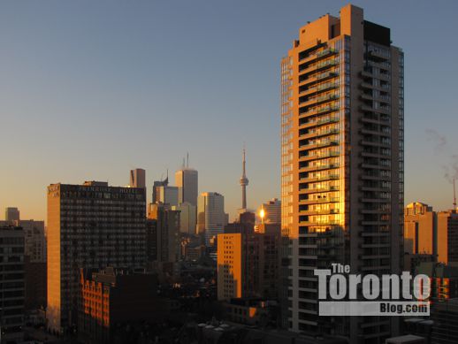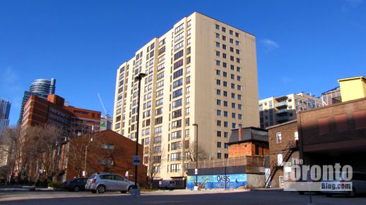 February 5 2012: The beige building to the northwest of the development site is the 16-storey 77 Carlton Street condominium, built in 1983