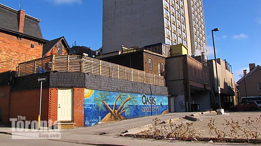 February 5 2012: Looking east along the block of Carlton Street immediately to the north of the proposed condo site. If built, the tower would soar behind the Oasis Aqua Lounge sex club, the brown brick building at right