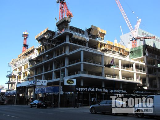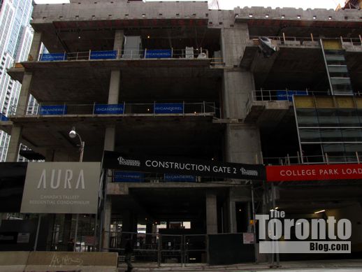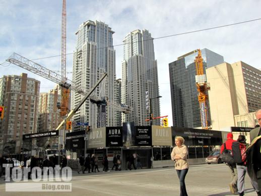 February 9 2012: A crane and more than half a dozen construction forms extend above the Aura podium over Gerrard Street