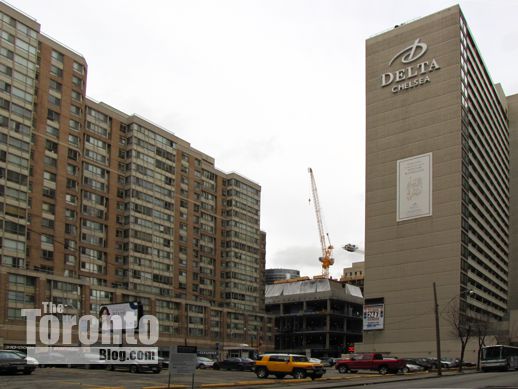 January 29 2012: A view of the Aura site from the northeast corner of Bay & Walton Streets. The 75-storey tower will ultimately dwarf the Delta Chelsea hotel, right, and the Liberties on Bay condos at 44 Gerrard Street West, left