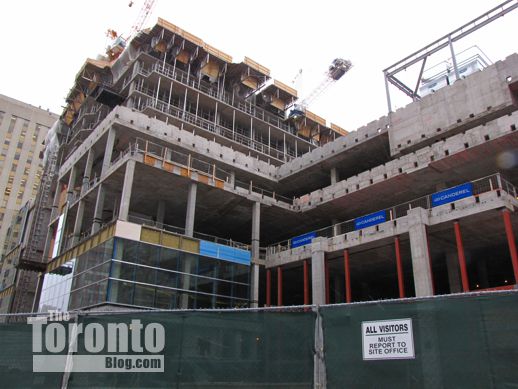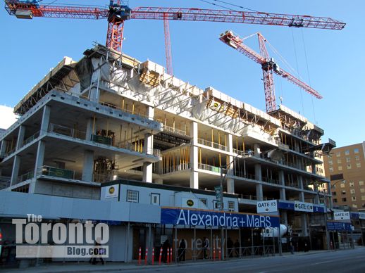 A little more than two blocks to the west, the MaRS Centre Phase 2 is transforming the College Street/University Avenue intersection in Toronto’s Discovery District, where construction of the new 750,000-square-foot office, research and laboratory building has reached the 6th floor on its way to a total of 20 storeys. The tower should rise quickly: according to a blog post by Shalana Morton, project coordinator for the MaRS real estate team, “floors five to 20 are all similar in floorplate, making them easier to form and, therefore, faster to build. We will now be completing one floor every 10 days, working toward a projected occupancy date of the fall 2013.”