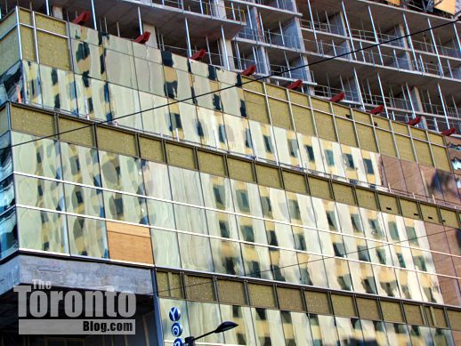 February 9 2012: The glass cladding on the Aura podium reflects the 19-storey office building at 415 Yonge Street to the east