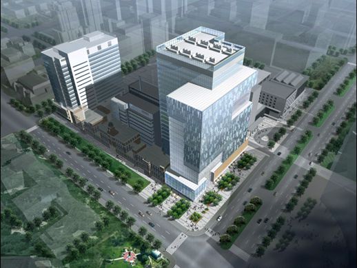 This aerial illustration of the tower appears on the Mars Phase 2 case study page of the Trillium Architectural Products website, and shows the existing MaRS Discovery District buildings along College Street to the left. The 20-storey, 750,000-square-foot Phase 2 tower was designed by B + H Architects.