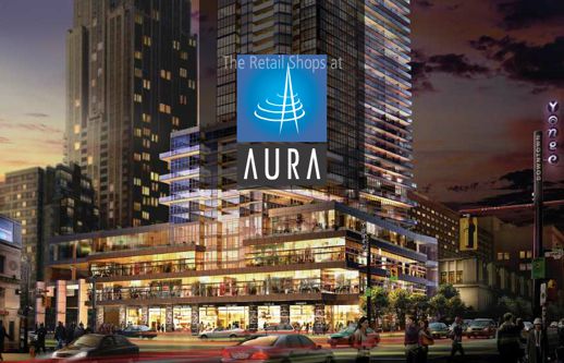 This artistic illustration, from the Aura website, suggests how the 3-level retail podium will appear when viewed from the northeast along Yonge Street
