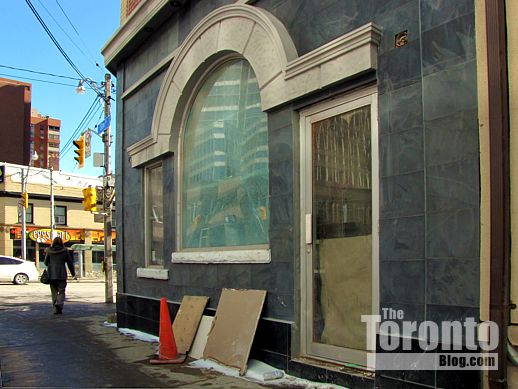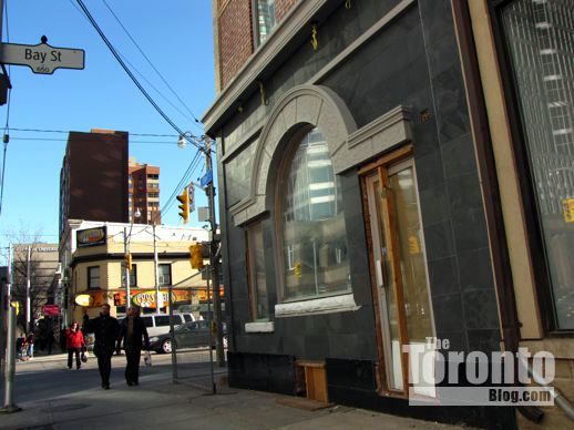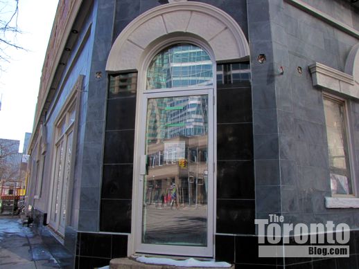 I previously reported on 650 Bay in a February 23 2011 post that included several photos showing the building with its new doors and windows, but before the exterior had been fixed up with limestone and the new faux-finish paint. Below is a series of pictures showing the building’s gradual transformation from then until today.