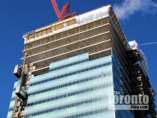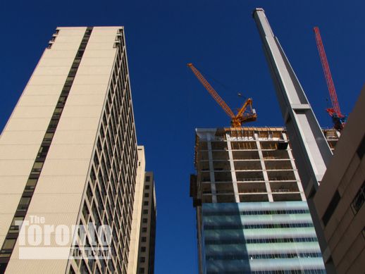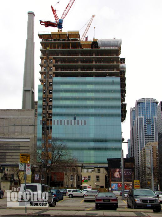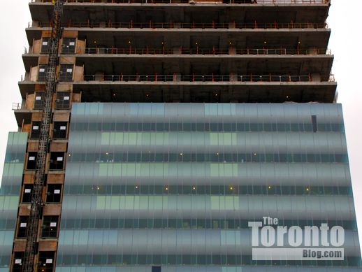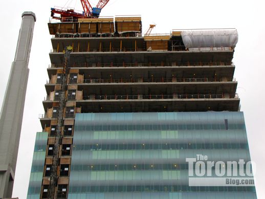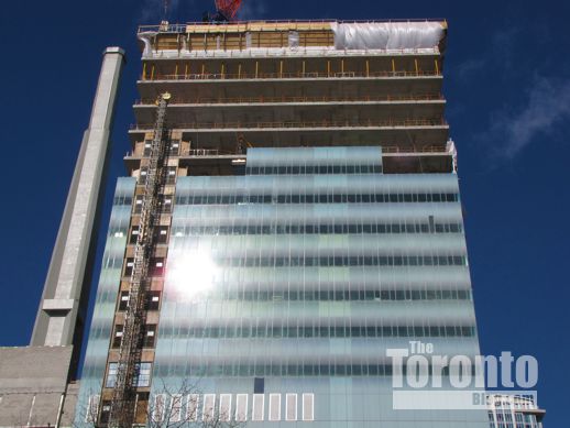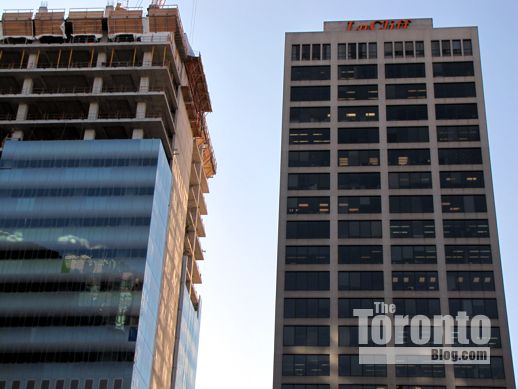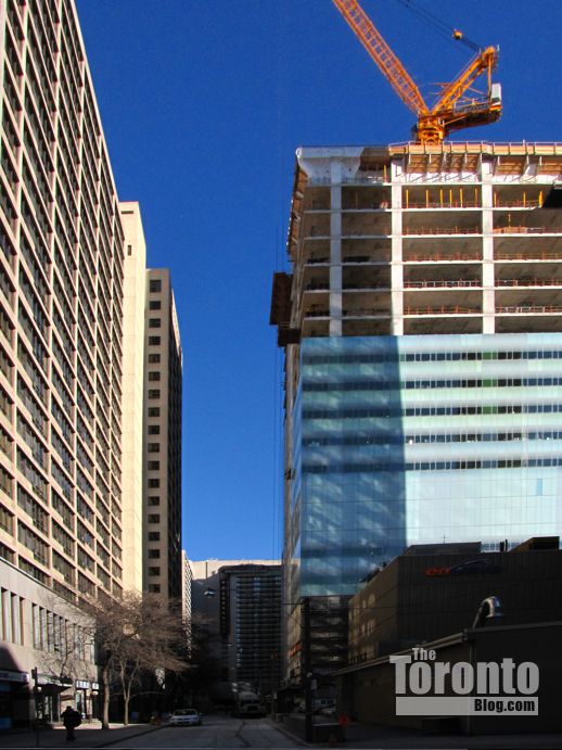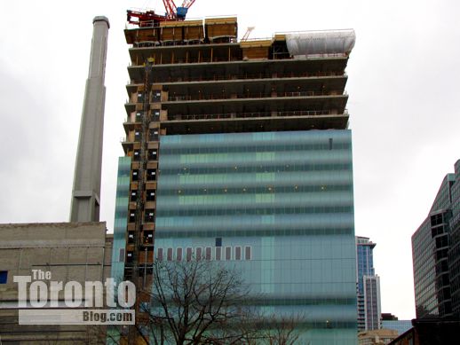 February 9 2012: East view of the SickKids Tower as it begins climbing higher than its 25-floor next-door neighbour to the north, LuCliff Place, an office and residential complex constructed in 1976.