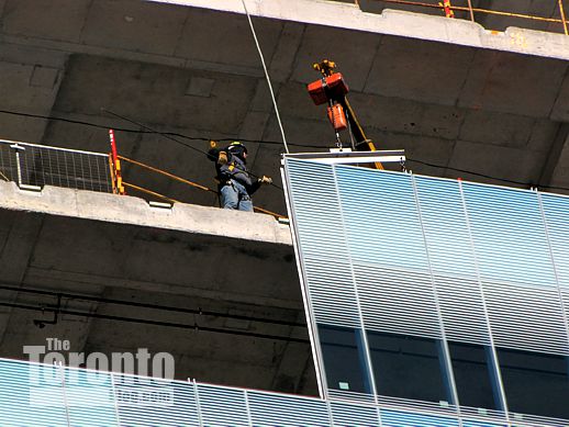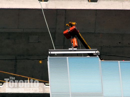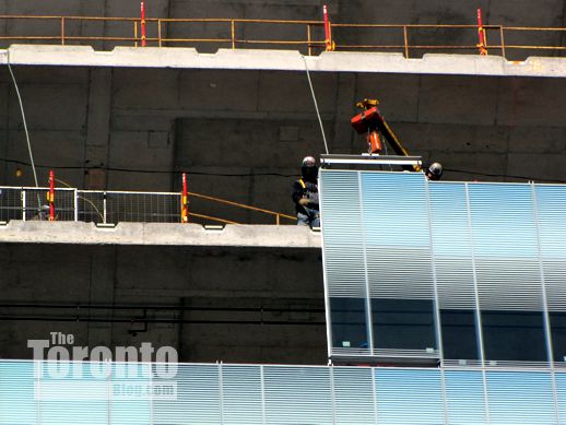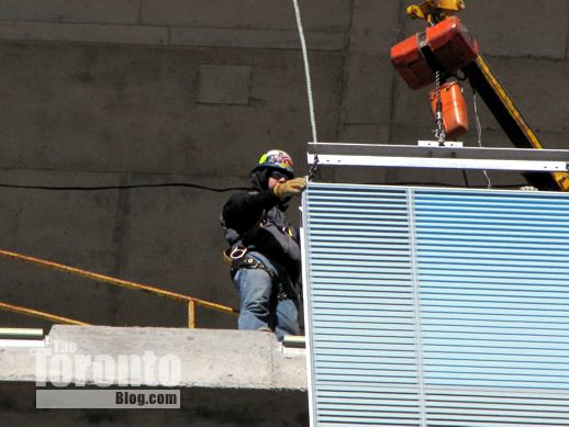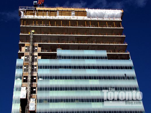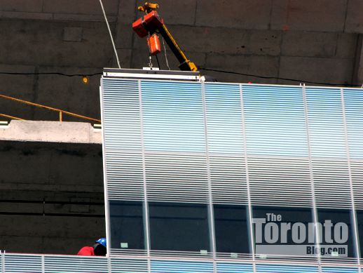 February 13 2012: Crews were installing glass cladding on the 14th and 15th floors this afternoon; here, they’ve already finished putting the middle section in place