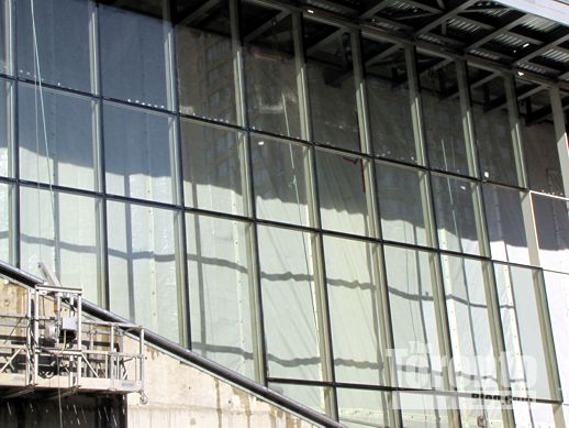 February 13 2012: Crews have installed many of the glass panes in the frame for the lobby wall along Elm Street