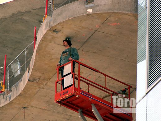 … where he surveys the spots where supports for the atrium’s window frames will be installed …