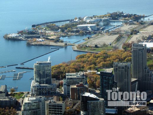 CN Tower view of Ontario Place‘s 90-acre waterfront property (top)